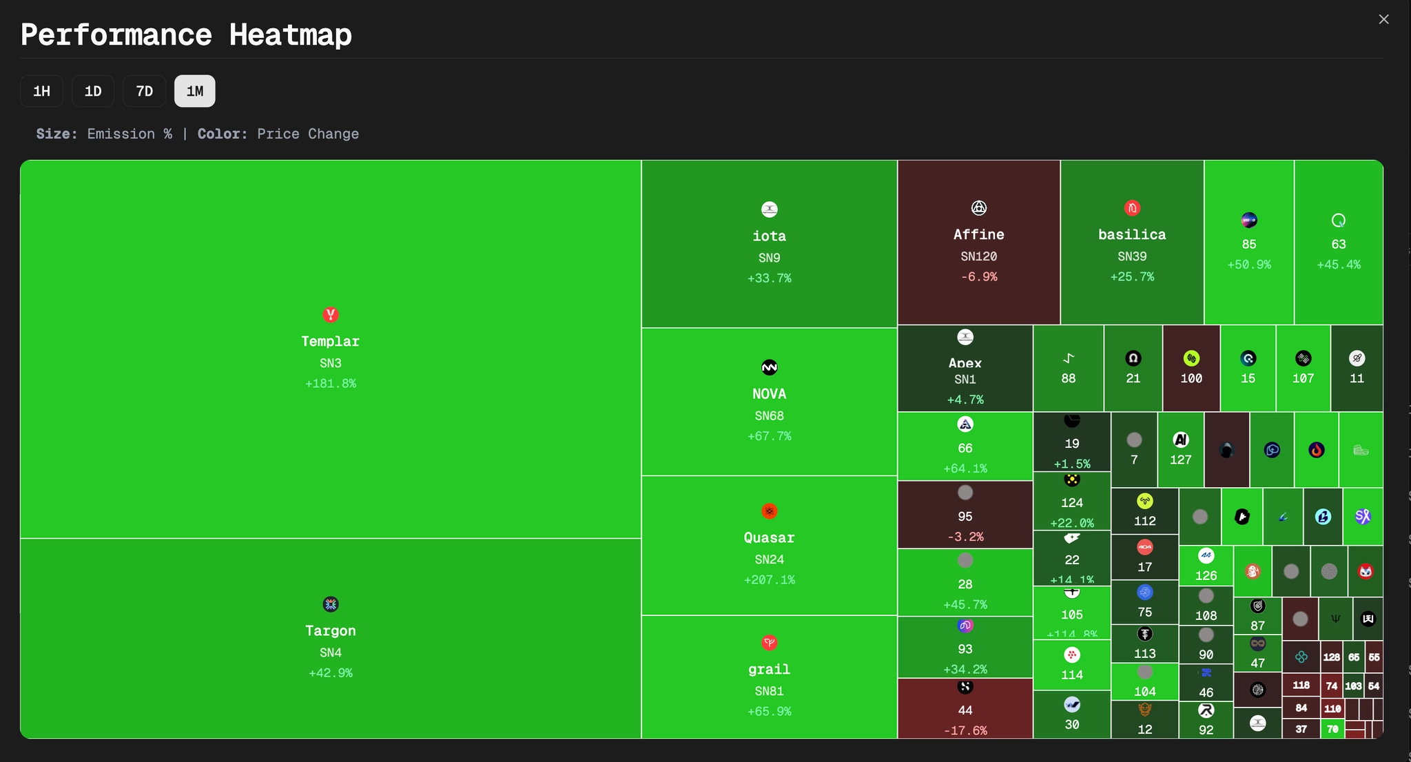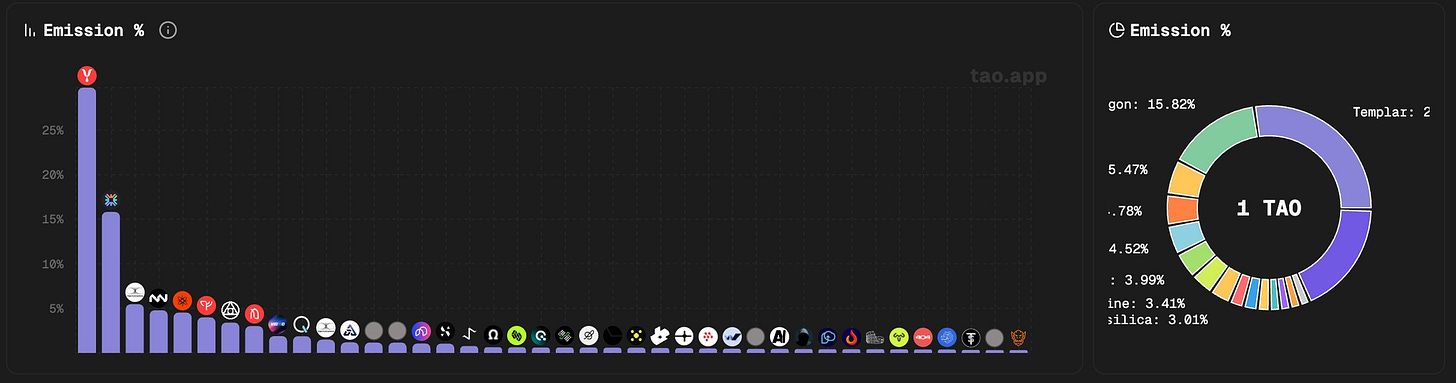 Currently captures ~30% of all daily emissions - the largest single share. The bull case is asymmetric: at ~$100M market cap, you’re pricing in almost nothing about what happens if decentralized training becomes the standard for open-source frontier models.