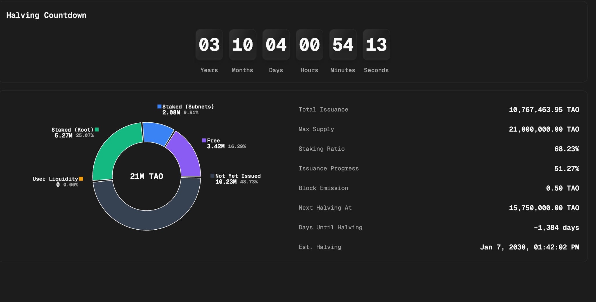 The surface-level halving story: daily emissions dropped from 7,200 to ~3,600 TAO on December 14, 2025. Less new supply = Bullish.