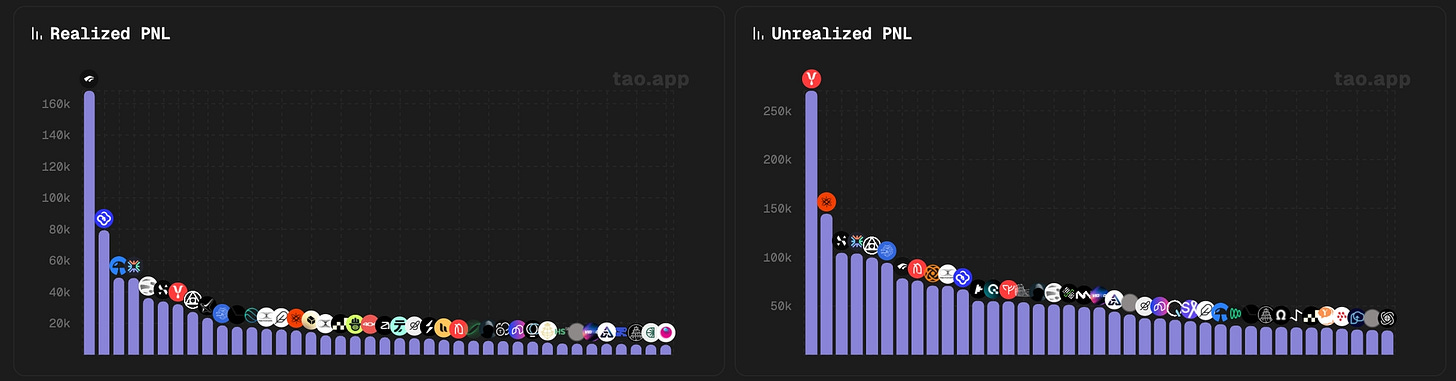 Targon (SN4): Proof that AI inference is a real business on this network. $10.5M annual revenue. ~10.4% emission share. $12.47M in realized PnL for stakers. The number that matters: rPnL exceeds $10M ARR, meaning stakers captured more than one full year of revenue equivalent in exit value.