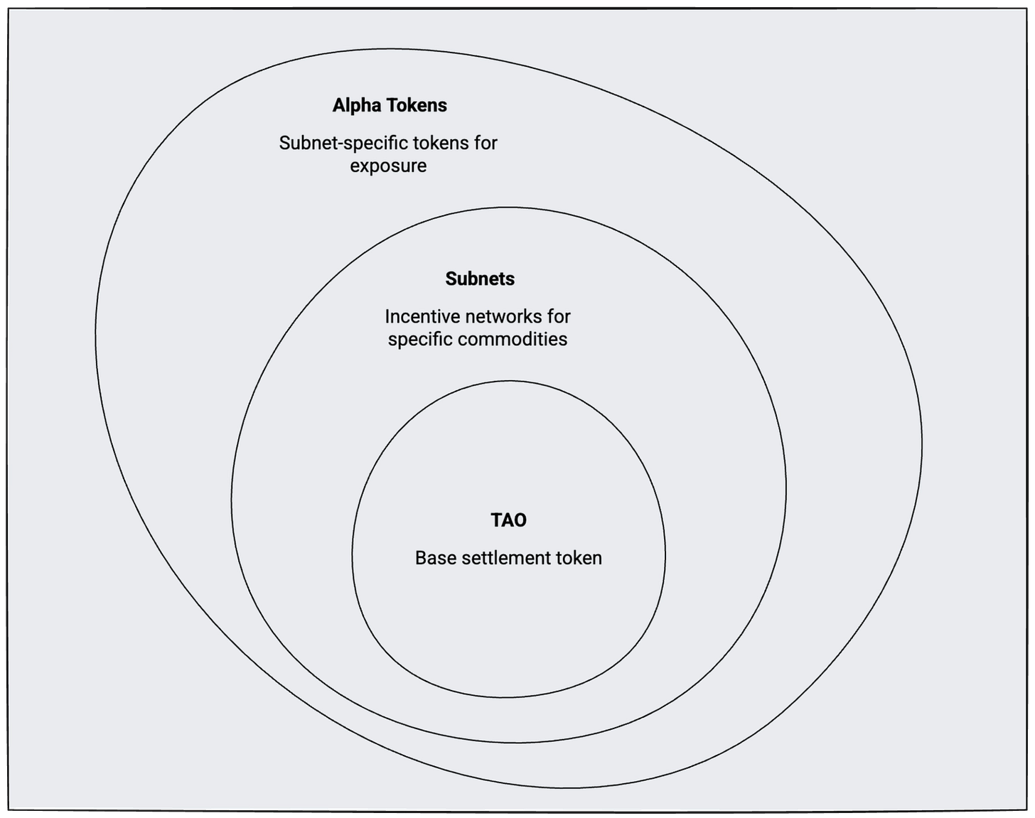 The three-layer structure (base layer → subnets → Alpha tokens)