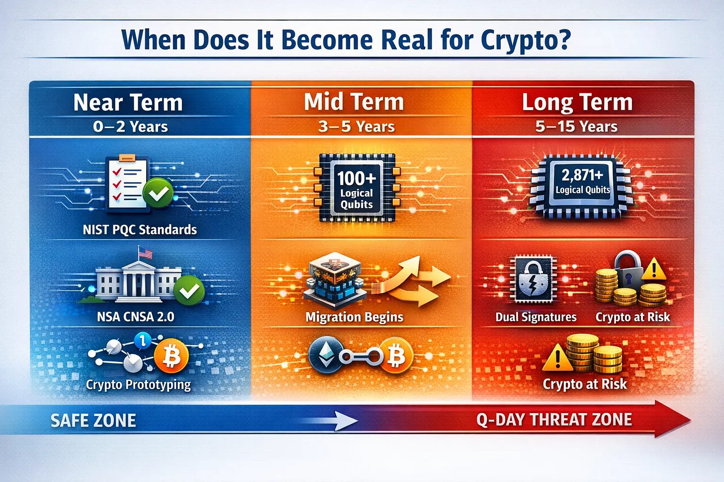 Cryptanalytic quantum capability is still 5–15 years away for mainstream crypto targets, but signature migration for Bitcoin/Ethereum class networks is a 6–10 year coordination problem.