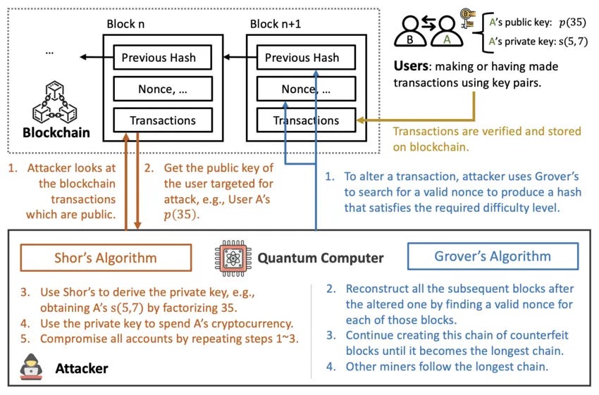 Meanwhile, hash functions (SHA-256, Keccak, SHA-3, etc.) only get a square-root speedup via Grover’s algorithm.